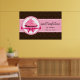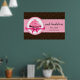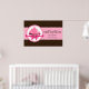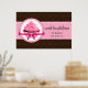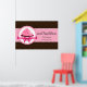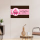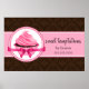 © 2014 Diseños de Socialite. Elegante diseño poster que incorpora un bizcocho con crema rosada dentro de un diseño de encaje redondo. Tu texto va en un banner rosa y blanco con un borde de encaje en vieiras. Una cinta rosa aporta un toque de elegancia al diseño. El fondo tiene un patrón de damasco marrón.