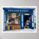 Una acuarela de una panadería colorida y nostálgica en Irlanda. El edificio blanco y azul contrasta con la colorida gama de productos que se encuentran en el escaparate y en la puerta.