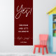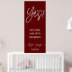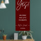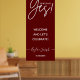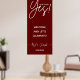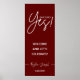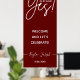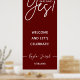Simple letrero de compromiso con caligrafía '¡Ella dijo que sí!' con opciones de color de fondo: burgundy, esmeralda, azul marino y óxido. Los nombres y la fecha del evento son totalmente editables.