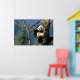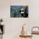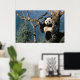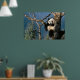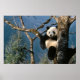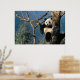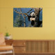 Un Panda en un poster de árbol. tiene un panda blanco y negro sentado en la parte superior de un árbol con un bosque detrás de él y un cielo azul. Esta es una hermosa foto.