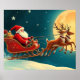 Papá Noel en trineo con renos por la noche con luna llena, ilustración popular.