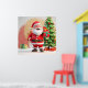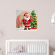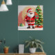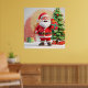 Papá Noel sosteniendo alegremente un regalo y rodeado de un árbol de Navidad decorado. La escena festiva ilustra celebración, alegría y espíritu navideño.