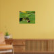 Este poster muestra una rana verde mirando al fotógrafo desde debajo de sus toallas de lirio. Acaba de dejar de llover. El sol se refleja en las gotas de agua. El tamaño de unas pocas hojas caídas demuestra lo pequeño que es este chico.
