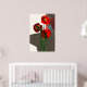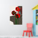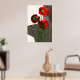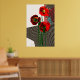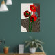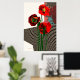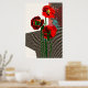 Diseño de amapola en rojos audaces y negro. Patrones de patrones para crear formas florales. Los ángulos geométricos definen tres amapolas en un jarrón.