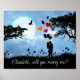 ¿Te casarás conmigo, proponiendo matrimonio? Un par de siluetas de besos en el parque con globos, árboles, pájaros, mariposas, flores y la luna llena. Celebra el amor con una propuesta boda. Listo para ser personalizado con su nombre. Excelente proponer matrimonio para un futuro boda y la publicación publicada por un aguijón.