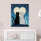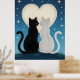 Dos gatos enamorados bajo un cielo estrellado azul y una luna blanca en forma de corazón. Ilustracion de estilo retro para felicitaciones bodas o El día de San Valentín.