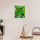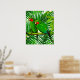 Poster en un ilustracion de un afectuoso par de loros verdes y rojos en una percha de bambú sobre un fondo de follaje de jungla