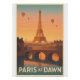 Diseño de afiches de viajes retro titulado "París al amanecer", mostrando la Torre Eiffel al amanecer. El cielo brilla con gradientes suaves de color rosa pastel, naranja y azul claro como primera luz solar