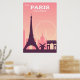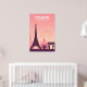 Este poster de viajes de color rosa rosa rosa le da un toque de encanto a su decoración, con un ilustracion retro de los monumentos de París, Francia, incluida la Torre Eiffel.