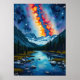 Esta obra de arte captura los impresionantes paisajes del Parque Nacional Jasper a lo largo de la vía láctea, una impresionante joya enclavada en el corazón de las Rockies Canadienses. Las montañas que se alzan, adornadas con antiguos glaciares, se levantan majestuosamente contra un telón de fondo de cielos azules vibrantes.