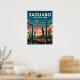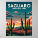 Ilustracion estilizado de una puesta de sol en el desierto sobre el Parque Nacional de Saguaro, con prominentes cactus de saguaro y nubes dramáticas.