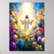 Feliz Pascua con esta vibrante decoración de vacaciones con jesus christ, vibrantes huevos de Pascua y arte floral para la escena de la resurrección.