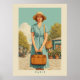 Un encantador ilustracion vintage de una mujer con un vestido azul polka-dot y un sombrero de sol, con una maleta de cuero en una calle empedrada parisina, rodeada de flores florecientes y tiendas clásicas.