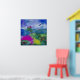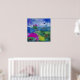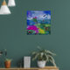 Impresionante pintura de un precioso pasto verde junto al mar, con interesantes árboles texturados sobre colinas verdes onduladas, contra un cielo azul con nubes brumosas y formas abstractas violetas y rojas en el pasto y en los árboles. Parece haber una figura voladora en el cielo. Inspirado y con reminiscencia de Chagall. Disponible en varios tamaños.