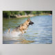 Un emocionado perro pastor alemán salta al agua al aire libre en un día soleado.