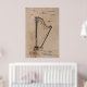 Un diagrama técnico de patente de un invento para un nuevo estilo de arpa de 1899 que ha sido diseñado para el arte mural sobre un fondo de estilo vintage.