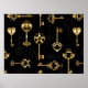 Patrón incomparable de llaves antiguas, doradas y de silueta sobre fondo negro.