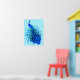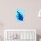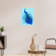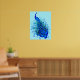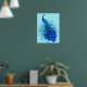 Poster en un fantástico pavo real de cola lujosa, en tonos turquesa y azul cobalto, sobre un suave fondo acuático
