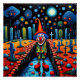 A.I. creó la impresión de un payaso sonriente con una nariz roja y un atuendo colorido en un cementerio surrealista bajo un cielo estrellado por la noche, rodeado de cruces vibrantes y estrellas brillantes.
