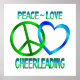 Los animadores pueden compartir sus sentimientos con este divertido diseño retro con un signo de paz, corazón y las palabras - Peace Love Cheerled.