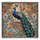 Un pavo real con una acuarela detallada con ojos expresivos se representa sobre un fondo suave y borroso. Los colores naturales realzan el aspecto realista.