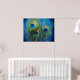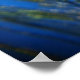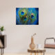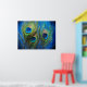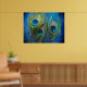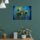 Esta fotografía azul de plumas de pavo real fue tomada con una lente de ojo de pez. Estas tres plumas tienen un hermoso color y hacen una gran idea de regalo. El fondo azul resalta los colores de los ojos de plumas de pavo real. Fotografía de pájaros divertidos que hace un poster espectacular para decorar cualquier habitación.