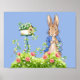 Pedro el conejo en su jardín revisando su casa de pájaros.