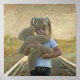 Niña pequeña con oso de peluche en las vías del ferrocarril.