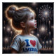 Una pequeña chica americana con el pelo atado en un moño desordenado mira asombrada ante una deslumbrante exhibición de fuegos artificiales y llevando una camiseta de "I Love America"