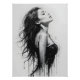 Un perfil inclinado hacia arriba de una mujer capturó el movimiento medio, como si le diera la vuelta a la cabeza. Su cabello se arrastra en trazos de tinta expresivos, complementados con goteos verticales dinámicos que enfatizan el movimiento y la energía. La obra transmite vívidamente un sentido de movimiento, vitalidad y expresión espontánea a través de técnicas de tinta audaz y líneas fluidas.