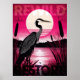 Una sorprendente imagen de una línea de arte de garza parada en un lago contra un cielo con puesta de sol magenta. Las palabras Rewild y Restore están integradas en el ilustracion para hacer una declaración audaz y urgente sin sobrecargar la belleza de la imagen.