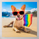 Esta linda foto muestra a un perro chihuahua en la playa llevando una bandera del Orgullo Gay de color arcoiris.