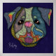 Único rostro de perro de Bulldog loco con audaces y coloridos patrones abstractos en un fondo azul. Popular con los amantes del perro y de las mascotas y los amantes del rescate de los perros.