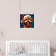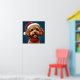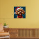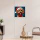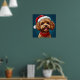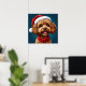Perro alegre y esponjoso que lleva un sombrero festivo de Santa rojo con ribete blanco y una bufanda roja a juego alrededor de su cuello. El pelaje rizado del perro es de un cálido color marrón dorado, y sus grandes ojos expresivos transmiten una sensación de alegría y diversión. El fondo es de un azul profundo, que realza los colores vibrantes de los accesorios del perro. En general, la imagen tiene un ambiente caprichoso y festivo, perfecto para la temporada navideña de Navidad.