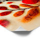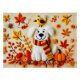 Hermosa obra de arte de fieltro de un perro mullido en un ambiente otoñal, rodeado de coloridas hojas caídas y un pequeño pájaro encaramado en su cabeza. Un diseño acogedor de artesanía de lana.