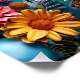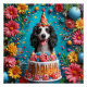 Un perro alegre con un gorra fiesta, rodeado de flores vibrantes y una torta de cumpleaños decorada con un brillante telón de fondo azul, exuberante alegría y celebración en un ambiente animado y juguetón.
