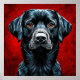 Ilustración llamativa de un perro labrador negro, representado de manera audaz y estilizada. El perro tiene una cara prominente y expresiva con ojos naranjas brillantes que transmiten una sensación de intensidad. El fondo es un rojo vibrante que contrasta marcadamente con el lustroso pelaje negro del perro, que se detalla con una variedad de tonos que resaltan su textura. La composición general le da a la pieza una presencia dinámica y poderosa, enfatizando las características del perro y creando un impacto visual atractivo.
