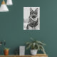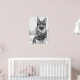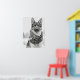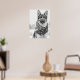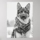 Captura la belleza intemporal del Pastor Alemán con este cautivador poster con una canina regal sentada en posición vertical en medio de un paisaje sereno y nevado. Con ojos penetrantes y una postura atenta, esta majestuosa raza exuda confianza y gracia.