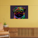 Lienzo de impresión de arte de pug. El pug es una raza de "juguete" de perro con una cara arrugada, con la boca amordazada y la cola curvada. La raza de pug tiene una capa fina y brillante que viene en una variedad de colores, y un cuerpo cuadrado compacto con músculo bien desarrollado. Originalmente, los pugs fueron criados para adornar las vueltas de los soberanos chinos durante la dinastía Shang (antes del 400 a.C.) en el este de China. El pug fue importado a Europa en el siglo XVI por la Compañía Holandesa de las Indias Orientales. Se dice que el pug se convirtió en el perro oficial de la Casa del Naranja en 1572 después de que un pug llamado Pompey salvara la vida del Príncipe de Naranja al alertarlo sobre el acercamiento de los asesinos.