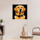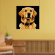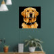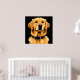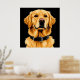 Ilustración vívida de un retriever dorado que lleva un collar negro contra un fondo oscuro. Destaca la expresión amistosa del perro y la textura distintiva de su pelaje, encapsulando calidez, lealtad y compañerismo.