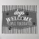 Los perros dan la bienvenida a las personas toleradas a la cita tiene un texto sobre el diseño original gris y blanco en tonos neutros para el arte en la pared en dormitorios, casa u oficina. Antecedentes derechos reservados de Ann Powell.