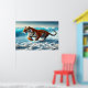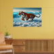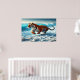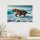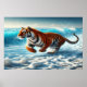 Un majestuoso tigre de Bengala, impulsado por el instinto y el poder, persigue un objetivo invisible a través de las aguas poco profundas del océano, creando una salpicadura de espuma blanca. Sus poderosos músculos se flexionan bajo sus distintivas franjas naranjas y negras. El vibrante azul del océano, el blanco brillante de la espuma salpicada y la luz del sol brillante crean una escena dinámica llena de movimiento y energía. El fondo borroso del océano acentúa la presencia salvaje del tigre.