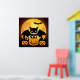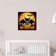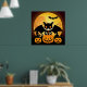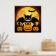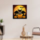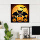 Obra ilustrada sobre el tema de Halloween con un gatito encantador con alas sobre una calabaza, iluminada por una brillante luna llena, rodeada de murciélagos festivos y lámparas jack-o', que capta un ambiente caprichoso y espeluznante.
