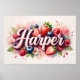 Celebra la dulzura y el encanto con este cartel personalizado con el nombre Harper en elegante letra 3D, rodeado de vibrantes frutas de acuarela y elementos florales suaves. Fresas jugosas, arándanos, frambuesas y delicadas flores se unen en una disposición botánica soñadora, perfecta para guarderías, habitaciones de niños o regalos de cumpleaños.