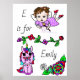 Añada el nombre inicial y el nombre de su hija a este poster de unicornio morado y hadas de bonito con flores extravagantes de estilo de arte folclórico.