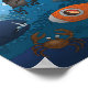 Este lindo poster, diseñado en tonos azules, muestra a un chico valiente explorando la vida submarina desde la ventana de su submarino. Viaja entre los corales y observa varios animales marinos como pulpos, tiburones, cangrejos, medusas. Poster ideal para la decoración de las habitaciones para niños.