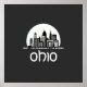 Un ilustracion minimalista y elegante en blanco y negro de un horizonte urbano, con varios rascacielos altos y una silueta de un parque debajo. La palabra "OHIO" aparece de forma prominente en la parte inferior, añadiendo un toque de orgullo estatal. El conjunto es limpio y moderno, con un marco circular que rodea el horizonte.