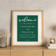 Este sólido poster de bienvenida de boda verde esmeralda presenta un guión blanco clásico para una pareja que se casa en un bosque u otro lugar natural. Celebra tu amor con este tranquilo color y coordina con nuestra colección de tipografías minimalistas.