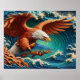 Un águila majestuoso con sus alas esparcidas por grandes remos triunfalmente sobre los poderosos, un águila majestuoso con sus alas esparcidas grandes olas triunfalmente sobre los poderosos, aunque el medio de una ola en el océano como un sufrimiento, capturando un pez de forma segura en sus agudos talones, mientras el cálido resplandor de las capas blancas ilumina la escena, resaltando las texturas intrincadas y el movimiento dinámico que se presentan sobre esta laguna. olas oceánicas, en esta textura de madera tallada.