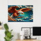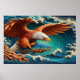 Un águila majestuoso con sus alas esparcidas grandes zarzas triunfalmente sobre los poderosos, aunque en medio de una ola en el océano como un sufrimiento, capturando un pez de forma segura en sus agudos talones, mientras el cálido resplandor de las capas blancas ilumina la escena, destacando las texturas intrincadas y el movimiento dinámico que se presenta sobre este águila por encima de las olas del océano, en esta textura de tallado de madera.
